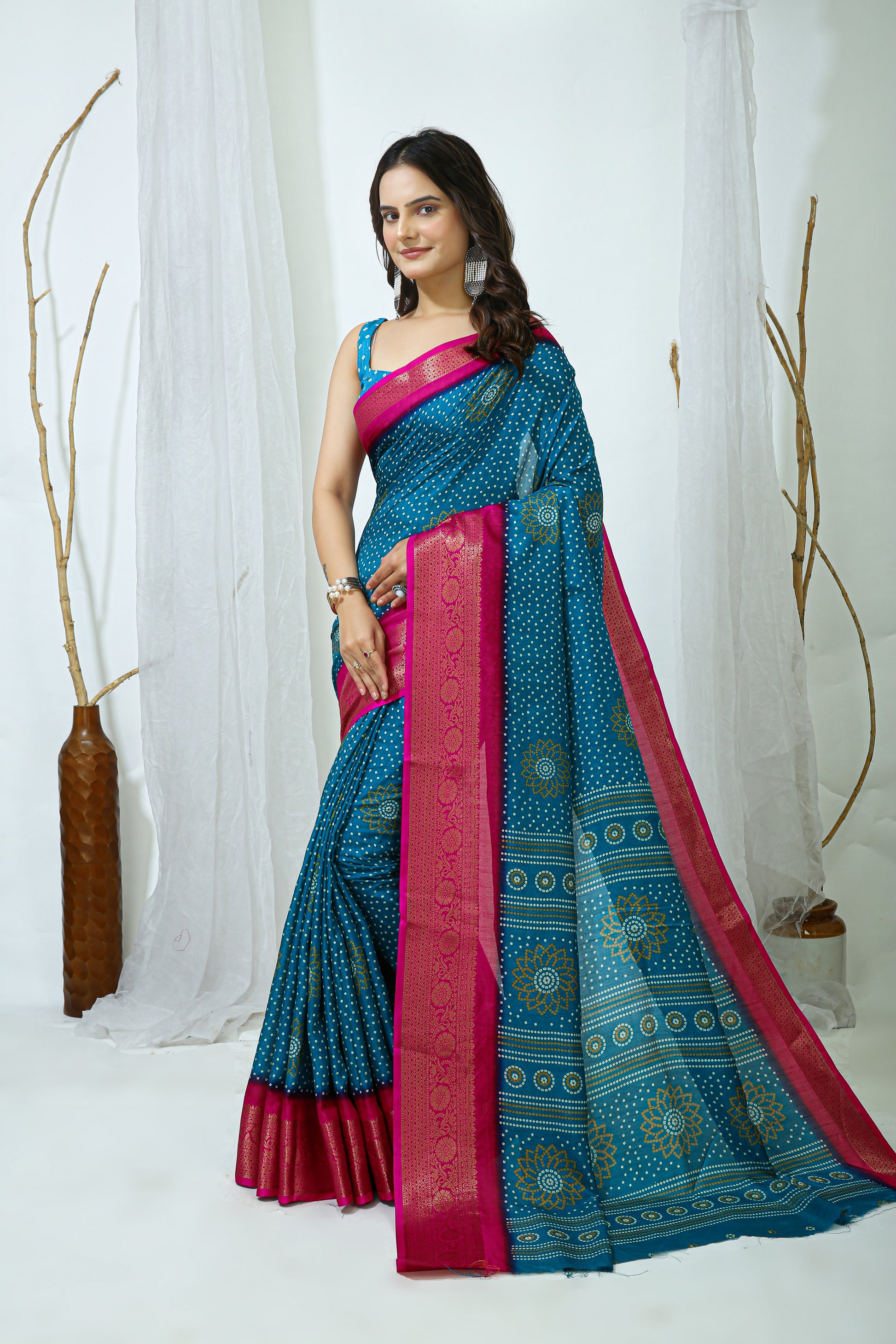 Blue Color Dola Cotton Fabric Kalamkari Print Saree With Printed Blouse Piece