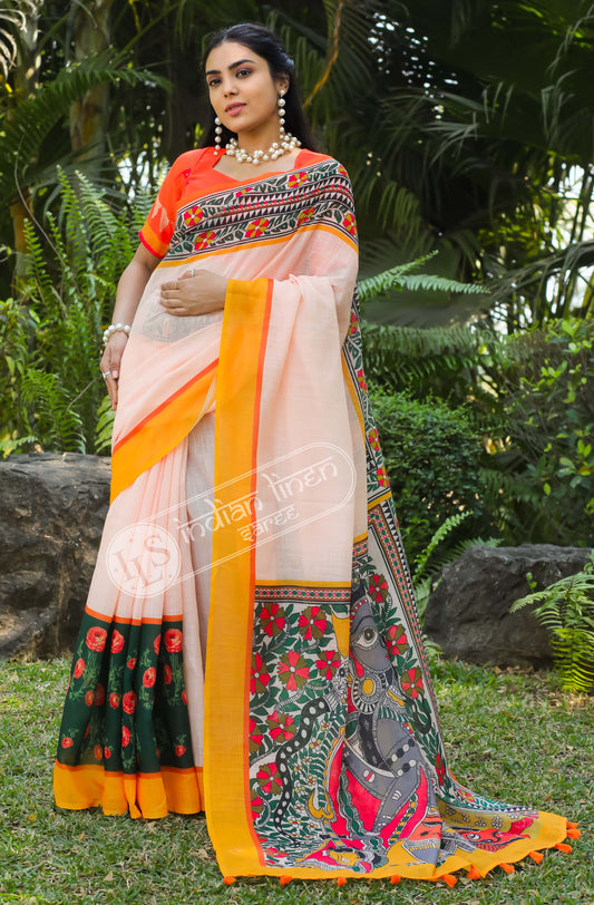 Majestic Black and Peach Cotton Linen Saree With Unstitched Blouse Piece For Women