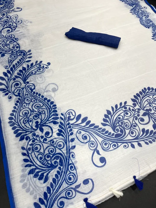 Charming White Color Cotton Linen Saree With Unstitched Blouse Piece For Women