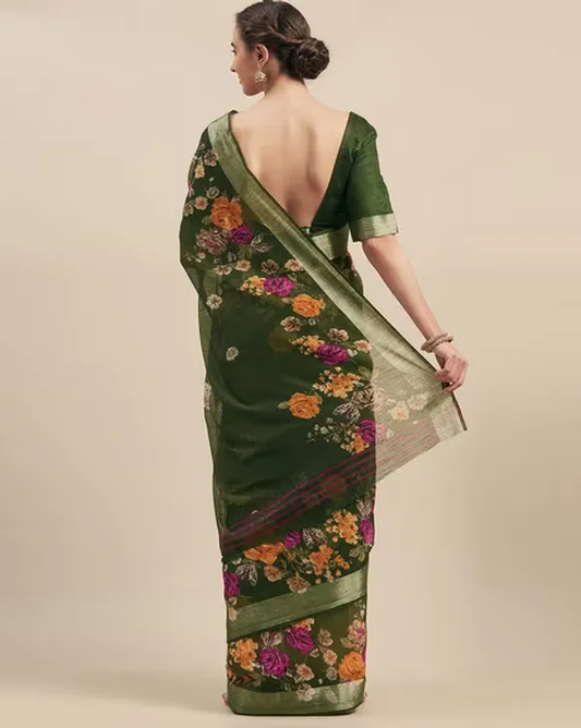 Charming Green Color Cotton Linen Saree With Unstitched Blouse Piece For Women