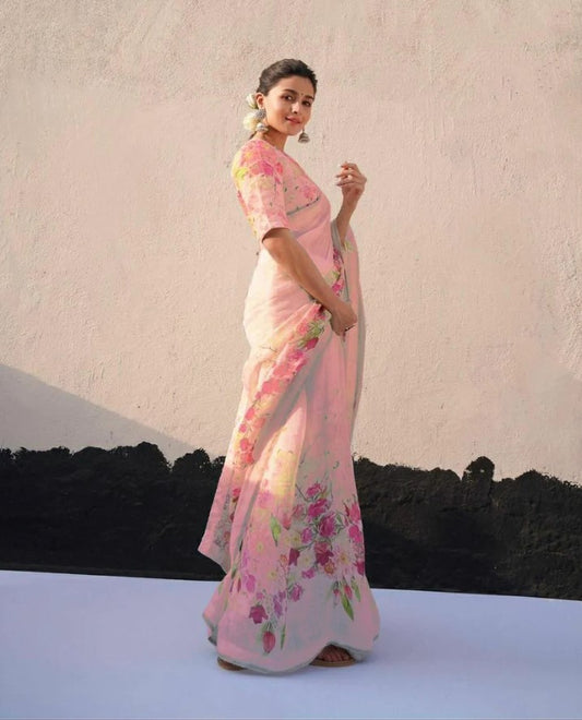 White and Pink Color Dola Cotton Fabric Digital Print Saree With Blouse Piece